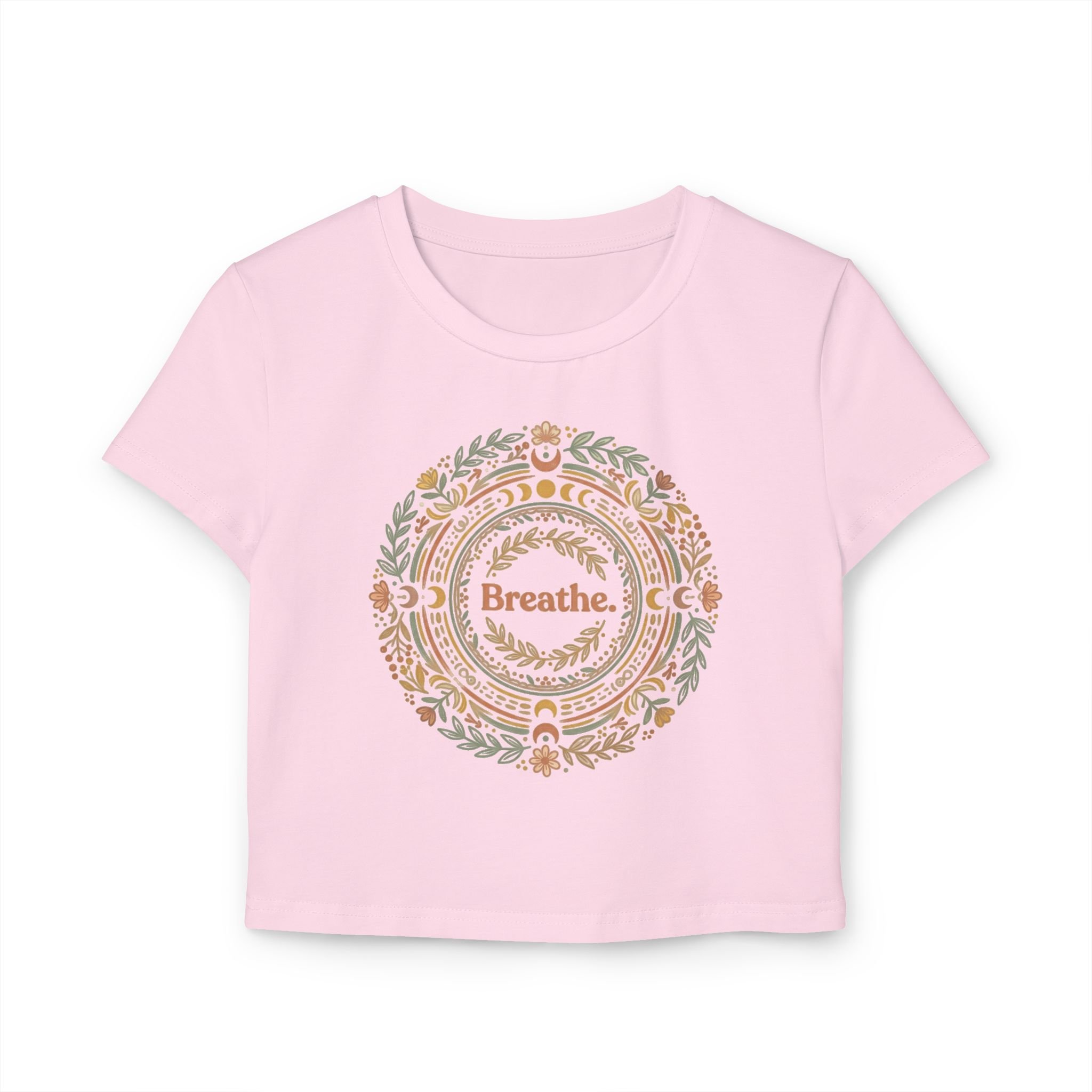 Soft, simple, and quietly uplifting — this slim-fit baby tee wears like a calm breath. Lightweight organic cotton feels cool against the skin while a warm, hand-drawn wreath sits at the center, framing the small, reassuring word “Breathe.” The muted earthy palette and delicate botanical linework give it a vintage, mindful vibe that layers effortlessly under a cardigan or pairs with high-waist jeans for easy, everyday comfort. It’s for mornings when you need a gentle reminder to slow down and evenings when you want to move through the day with more presence.
