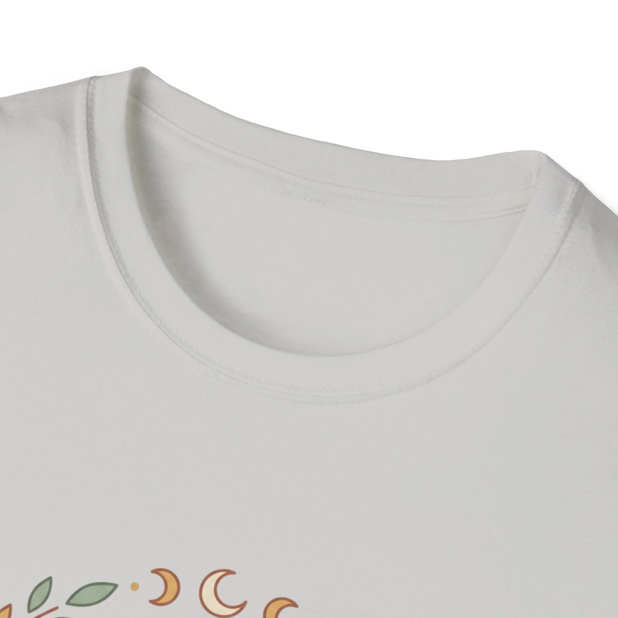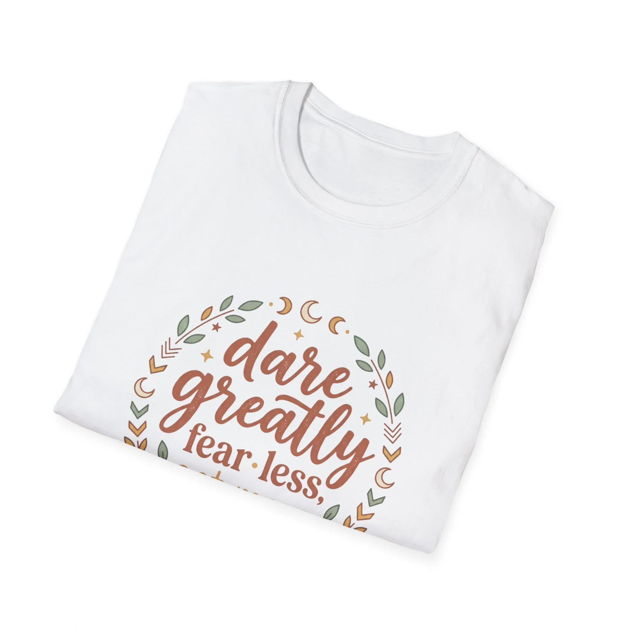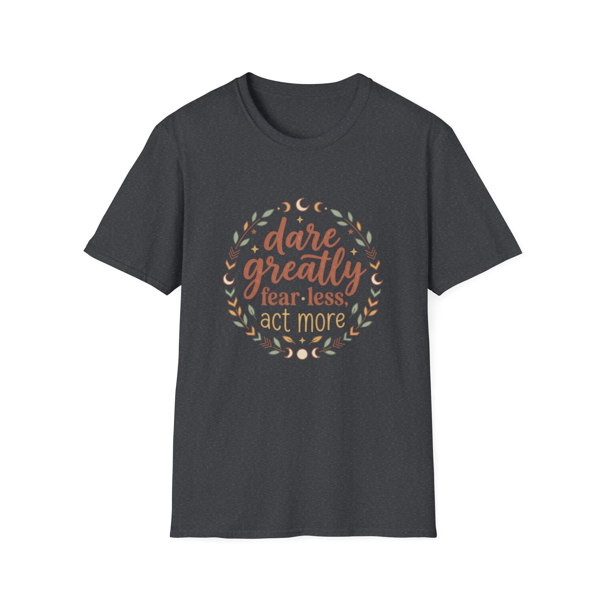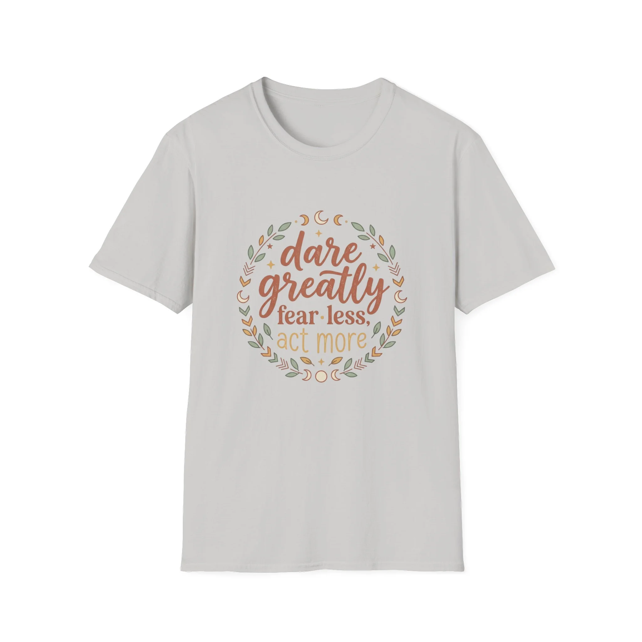 Lightweight, comfortable, and quietly inspiring — this crew-neck tee carries a soft, hand-drawn message wrapped in a delicate wreath of leaves and moons. The gentle, earthy palette and brush-style lettering feel like a whispered reminder to move forward: “dare greatly, fear less, act more.” Wear it on slow mornings with jeans, layered under a cardigan for errands, or as a calming piece for busy days when you need a little nudge. The fabric breathes and drapes easily, so the design sits naturally on the chest instead of shouting. It’s the kind of shirt that settles into your routine and keeps offering the same subtle encouragement every time you reach for it.